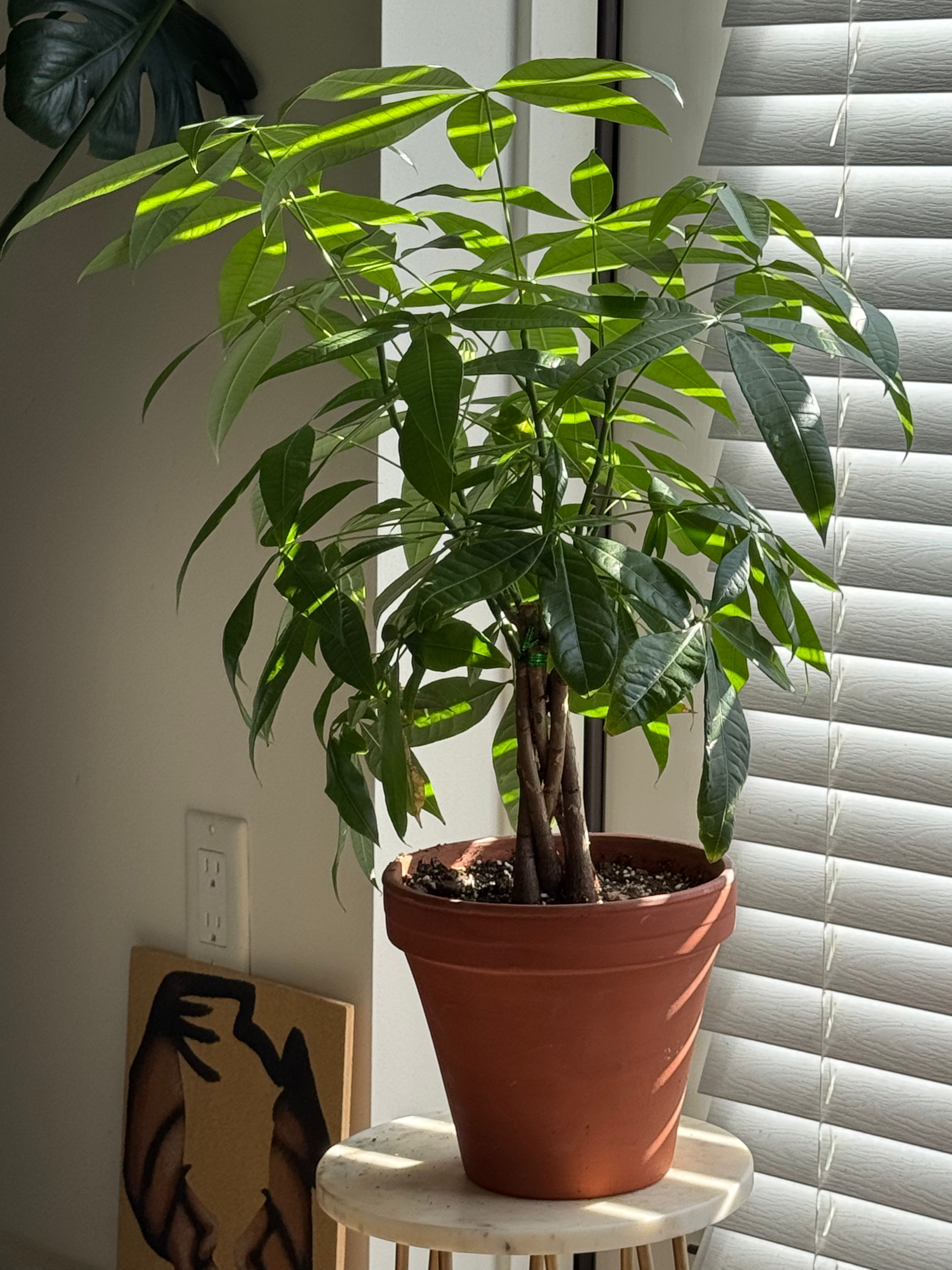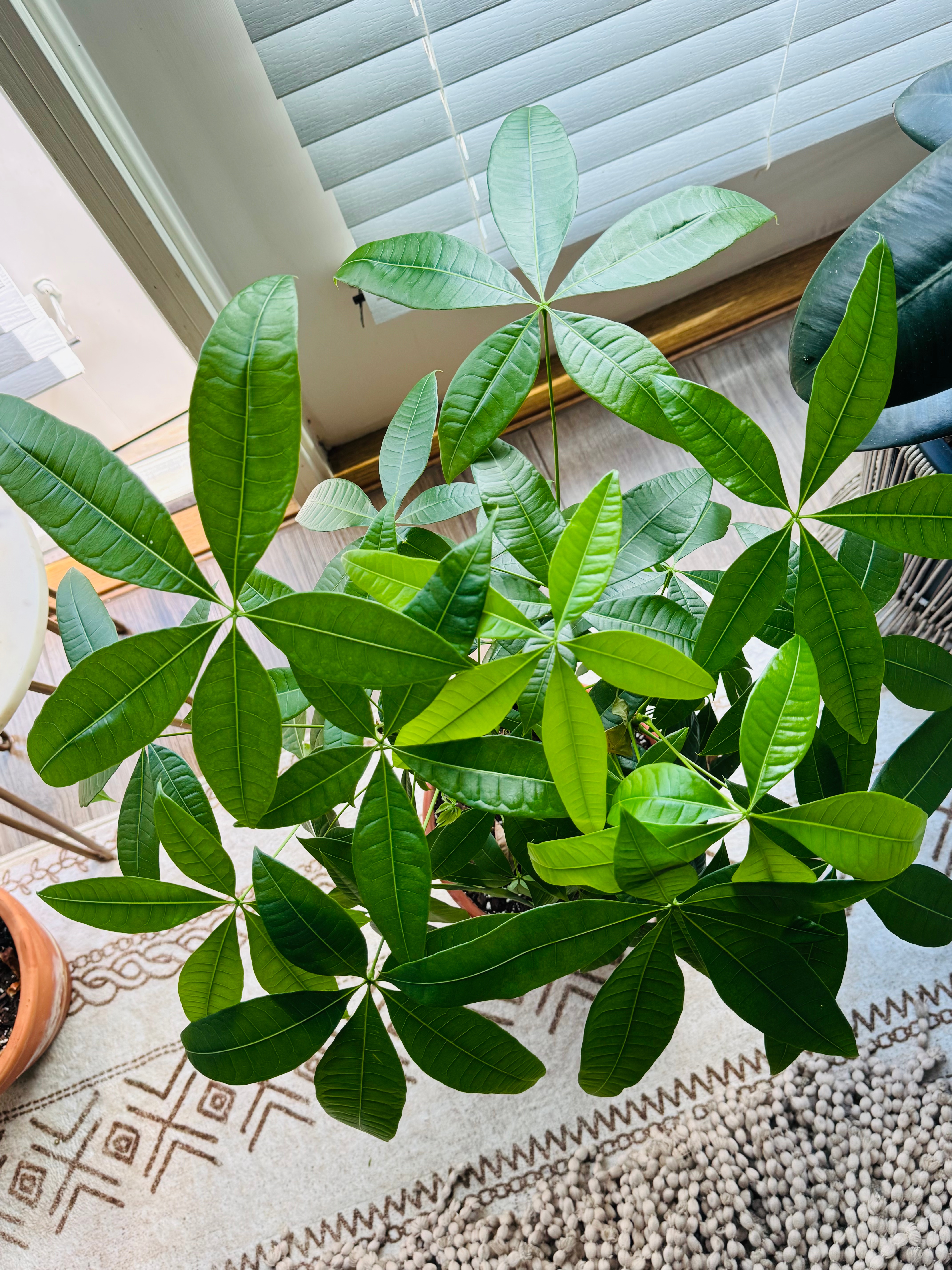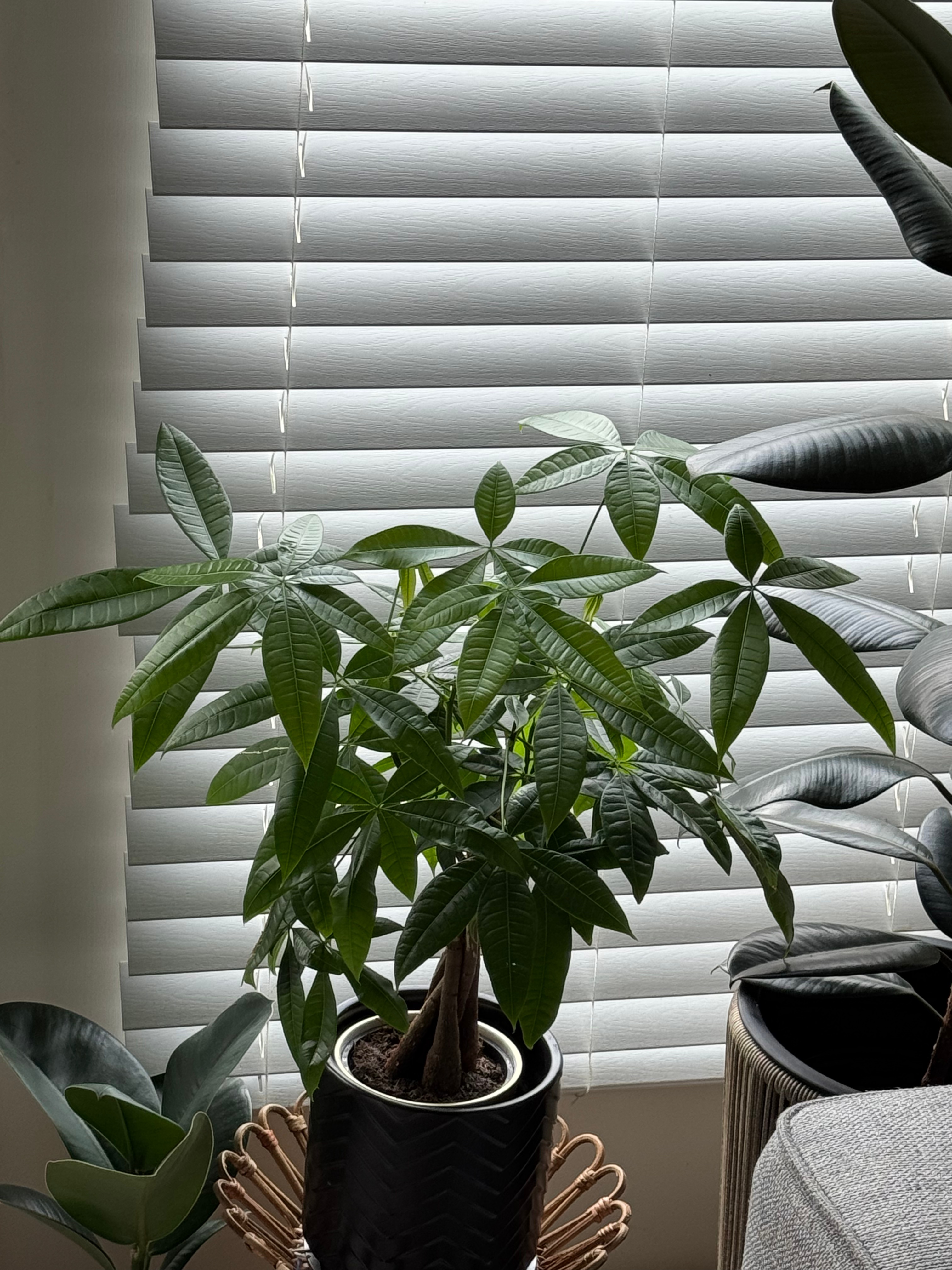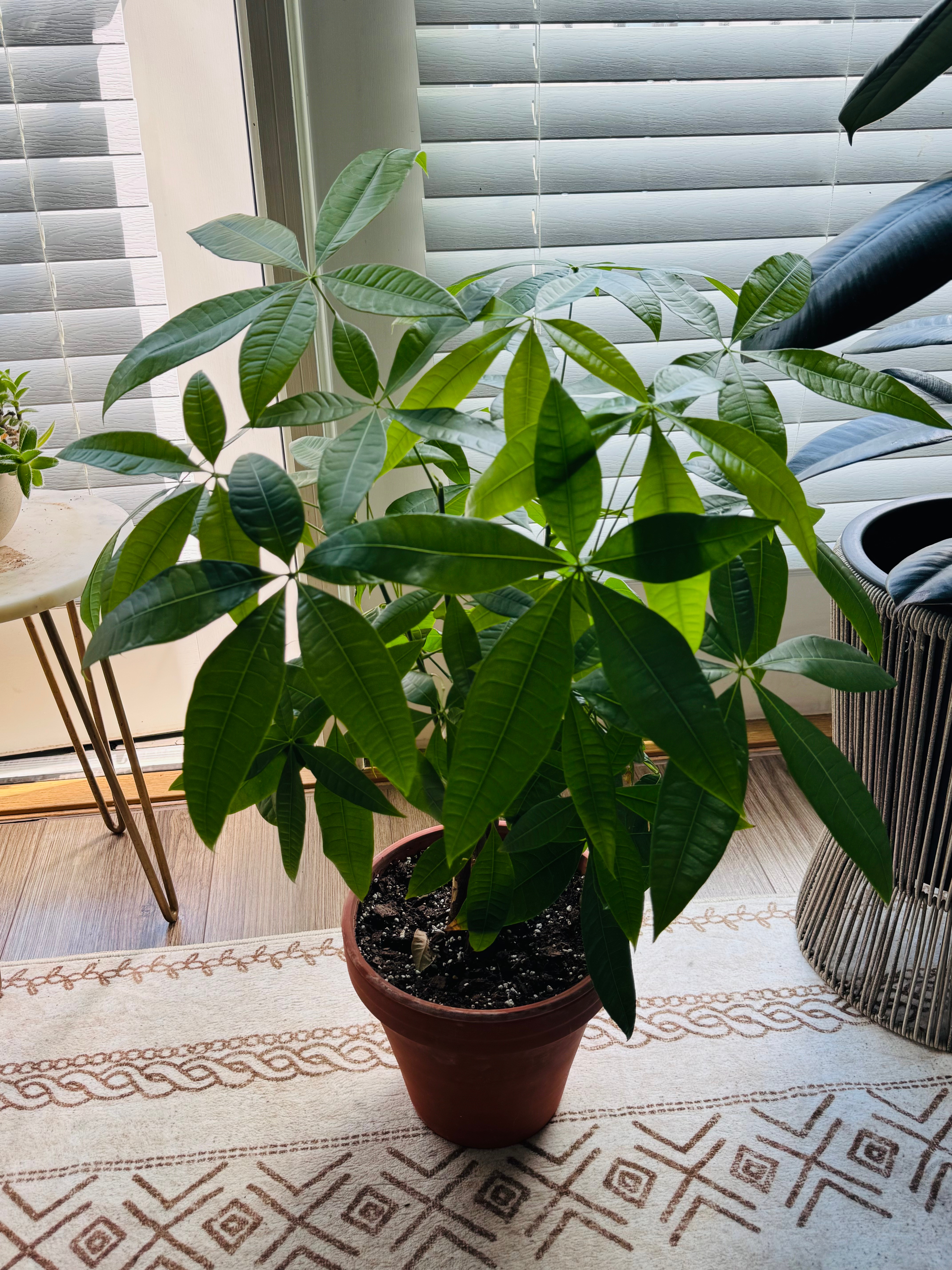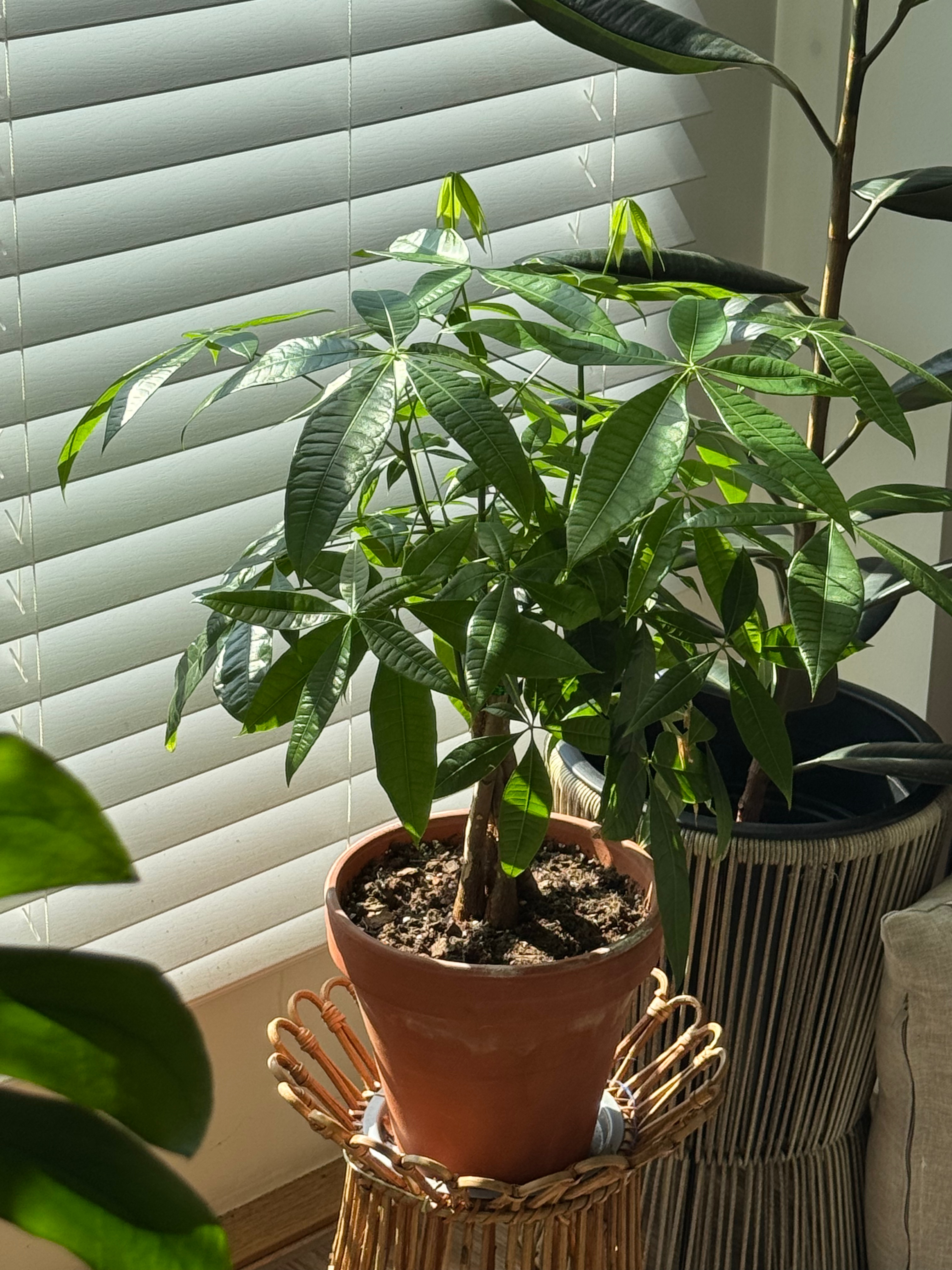 The Money Tree, also known as Pachira aquatica, is surprisingly easy to care for. I can’t remember the exact date I brought this one home, but it joined my collection sometime at the beginning of 2025. While Money Trees aren’t low-light tolerant, they thrive in bright, indirect light, something I am very lucky to have thanks to a balcony that fills my space with sunlight every day. As you scroll through the gallery below, you’ll see how much it has changed and grown over time. It clearly loves the cozy little spot I have created for it in my home.